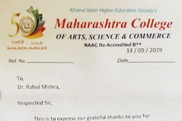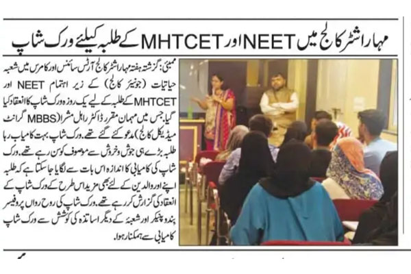 25-9-2019 Urdu Sahafat Newspaper's report regarding workshop for the students of NEET and MHTCET at Maharashtra Collage...